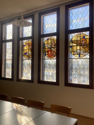 Hinter der Beckerath-Orgel in der Wohltorfer Kirche gibt es noch einen Raum, der im Sonnenschein ganau wie im Kirchraum die Evangelisten im Fensterglas regelrecht strahlen lässt. Zwei Helferlein haben auf- und umgeräumt und gerade scheint auch noch die Sonne rein.